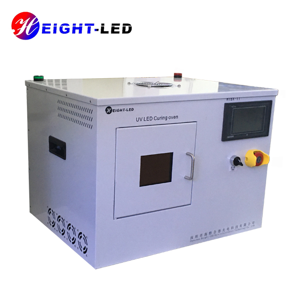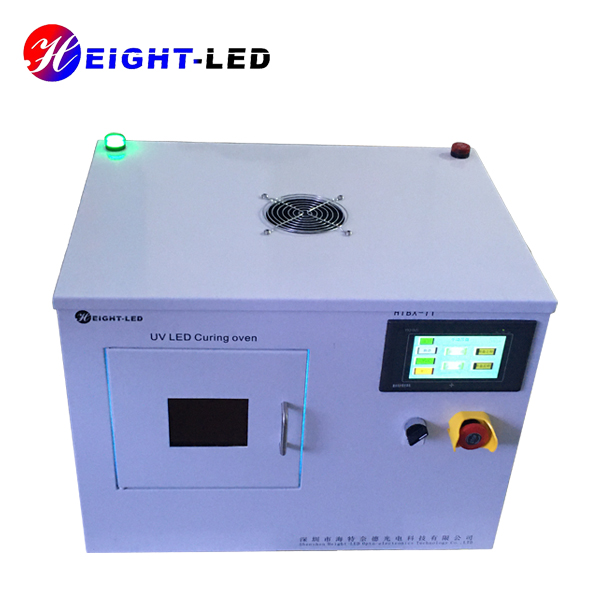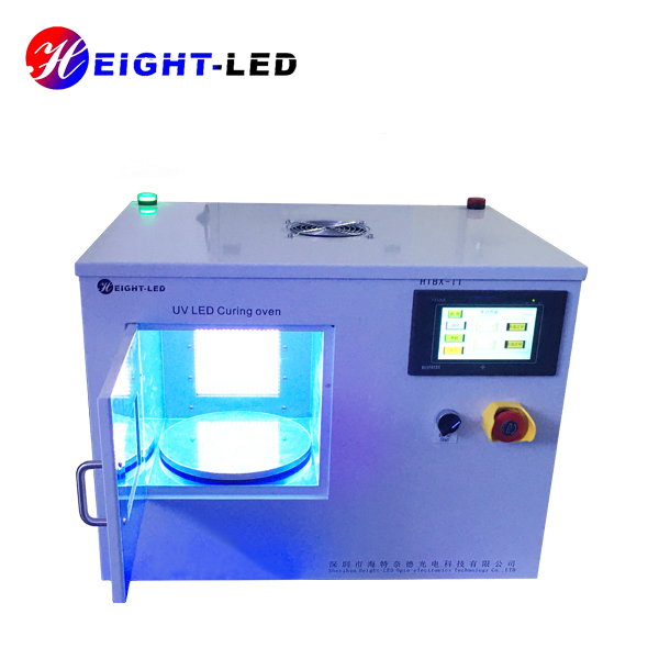一款針對UV膠粘劑固化設計的高性能UVLED光固化系統,該系統采用箱式結構內部放置UVLED照射頭及控制板,外加可透視窗口。共有兩個出光面,頂部出光面積200X200mm,側面出光面積為150X120mm,UV光譜波長為365nm,采用強制水冷散熱,支持外部信號輸入及觸發,箱門處裝有傳感器,關門燈亮關門即滅,底部裝有轉盤,可根據需要調整轉速,保證受光均勻度及異型件側面點膠位置的UV固化能夠充分進行。